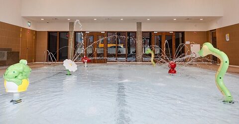 Het pas geopende zwembad van het sportcentrum heeft sprayelementen en led fountains die op de beweegbare bodem geplaatst kunnen worden.